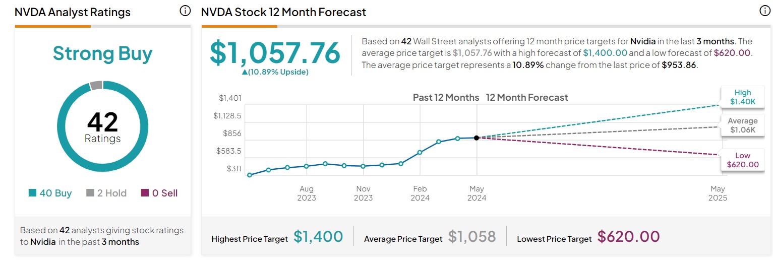 Tipranks汇编的华尔街目标价显示,在英伟达公布财报之前,华尔街投资机构普遍看好英伟达后市股价走势,反映一致预期的平均目标价甚至高达1057.76美元,意味着未来12个月至少接近11%的潜在上行空间,最高目标价甚至高达1400美元。