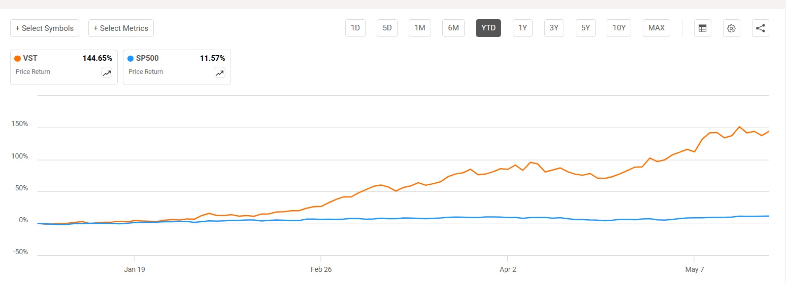 电力股与可再生能源股今年最猛烈的涨势从4月开启,AI热潮以及避险因素共同推动这两大类别上涨。在美股市场,自4月16日美股基准股指——标普500指数(S&P 500)触及近期底部以来,公用事业类股票一路走高,以电力股为主的公用事业ETF(XLU.US)涨幅近15%,占该ETF今年迄今为止接近20%涨幅的大部分比重。其中美国电力巨头Vistra Energy(VST.US) 年内涨幅更是达到惊人的145%。