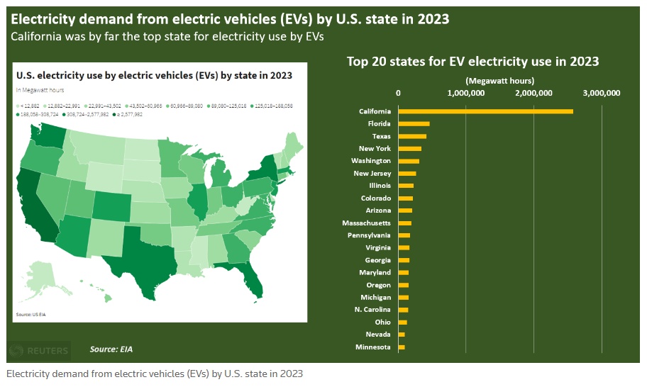 电动汽车用电量最高的州是美国人口最多的加利福尼亚州,该州的电动汽车用电量为258万MWh,占全国电动汽车总用电需求的近34%。