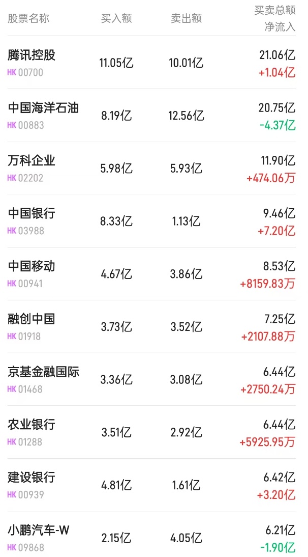 北水净买入最多的个股是中国银行(03988)、建设银行(00939)、腾讯(00700)。北水净卖出最多的个股是小鹏汽车-W(09868)、万科企业(02202)、中海油(00883)。
