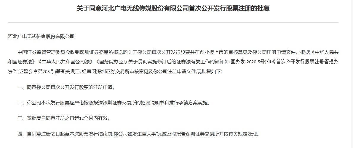 智通财经APP获悉,5月22日,中国证监会发布《关于同意河北广电无线传媒股份有限公司首次公开发行股票注册的批复》。据悉,河北广电无线传媒股份有限公司(简称:无线传媒)拟在深交所创业板上市,中信建投为其保荐机构,拟募资11.4976亿元。