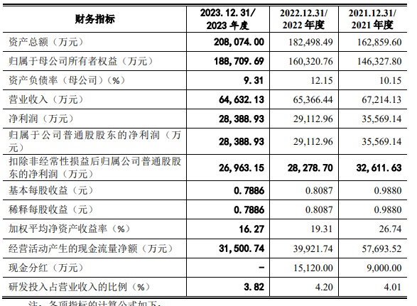 财务方面,2021年、2022年、2023年,公司营业收入分别约为6.72亿元、6.54亿元、6.46亿元,分别实现净利润约为3.56亿元、2.91亿元、2.84亿元。