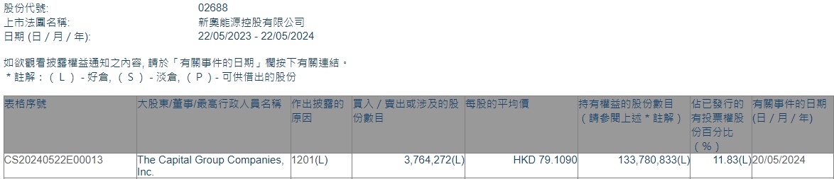 Inc.减持新奥能源(02688)376.4272万股,平均每股作价为79.109港元,总金额约为2.98亿港元。减持后最新持股数目约为1.34亿股,最新持股比例为11.83%。