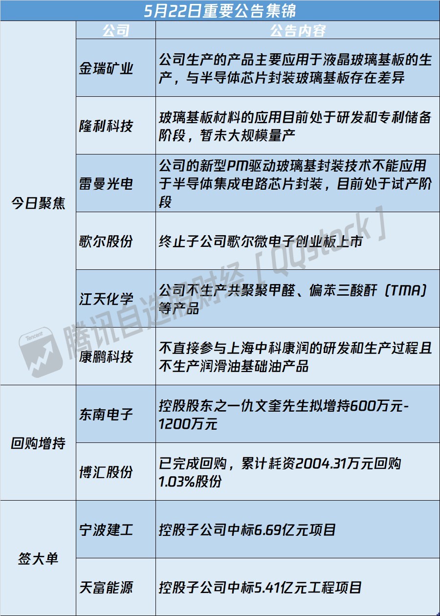 隆利科技发布股价异动公告,公司主营背光显示模组产品,Mini-LED背光显示模组的原材料中会涉及基板材料,其中玻璃基板材料的应用目前处于研发和专利储备阶段,暂未大规模量产,未对公司经营造成重大影响。