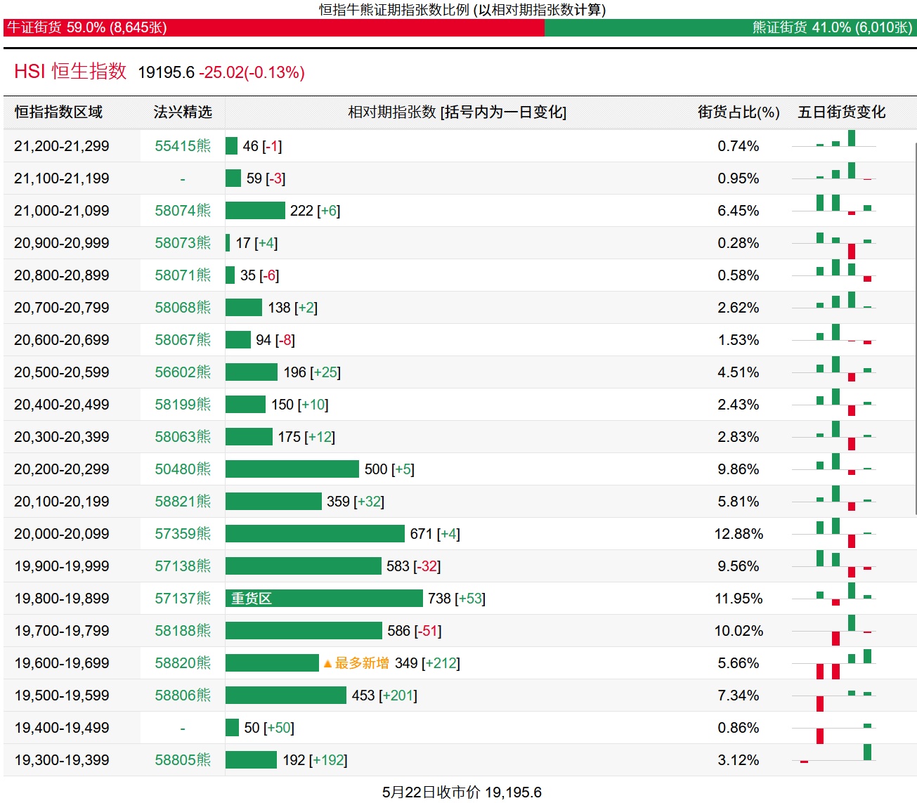 法兴恒指牛熊证街货分布图中的数据显示,熊证街货重货区在19800-19899区间,该区间最新熊证数量为738张,较上一交易日增加53张;最多新增在19600-19699区间,该区间最新熊证数量为349张,较上一交易日增加212张。
