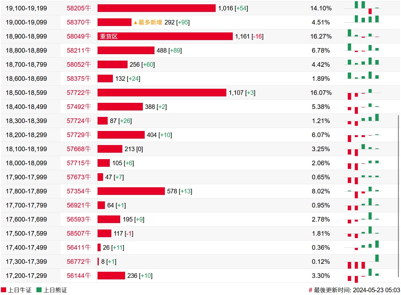 牛证街货重货区在18900-18999区间,该区间最新牛证数量为1161张,较上一交易日减少16张;最多新增在19000-19099区间,该区间最新牛证数量为292张,较上一交易日增加95张。