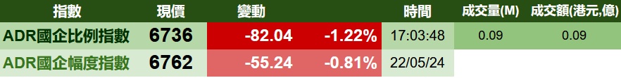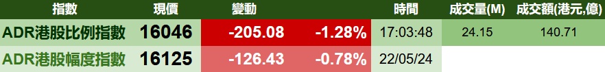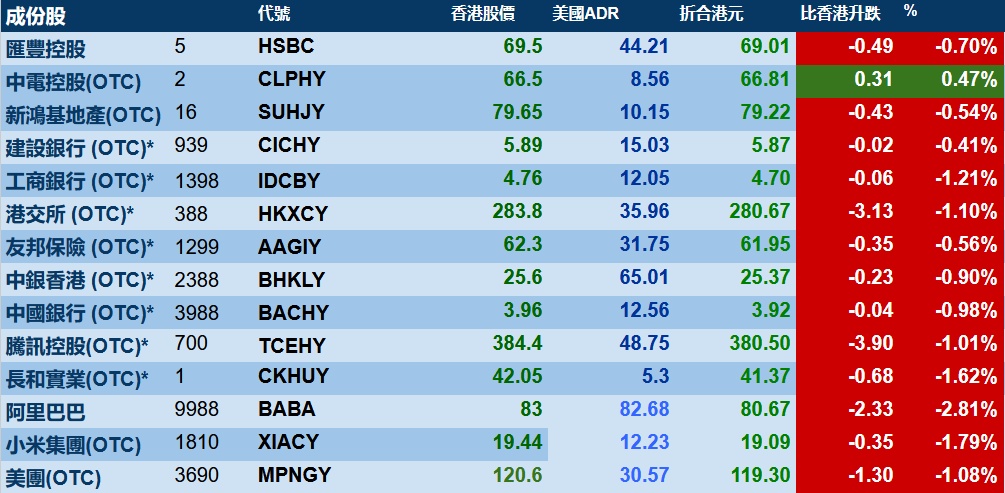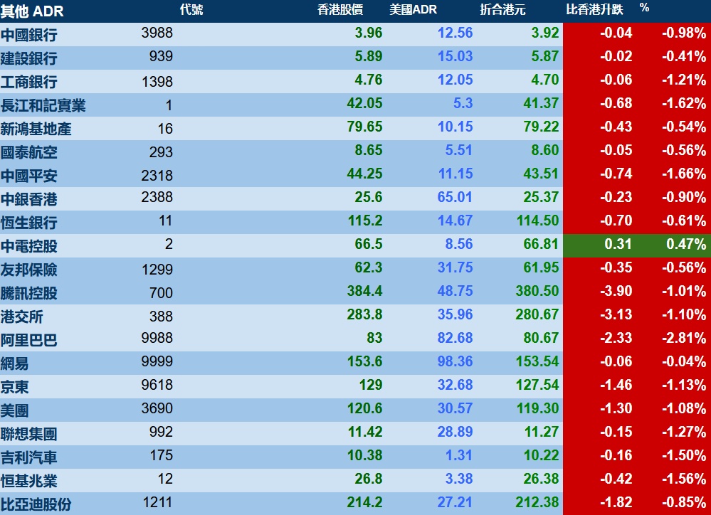 智通财经APP获悉,周三美股三大指数收跌,港股ADR指数下跌,按比例计算,收报16046点,较香港收市下跌205.08点或1.28%。