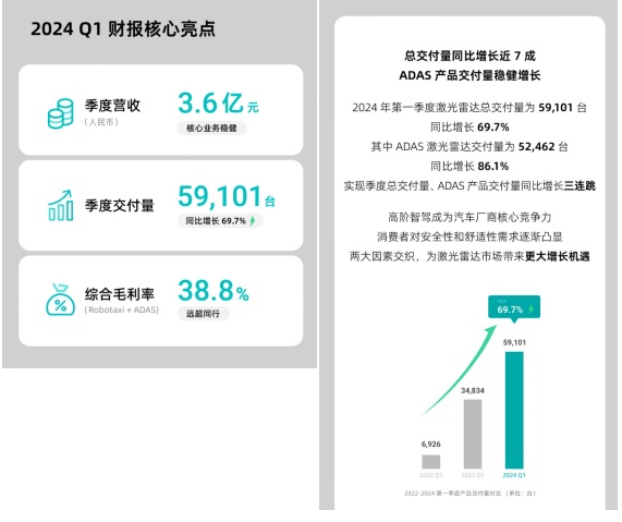 第一季度,禾赛科技实现营收3.6亿元人民币;激光雷达总交付量达59,101台,同比增长69.7%;其中ADAS产品交付量为52,462台,同比增长86.1%。Robotaxi业务和ADAS业务综合毛利率为38.8%,展现了出色的经营效率和商业化能力。据禾赛相关负责人透露:“公司预计Q4实现盈利。”