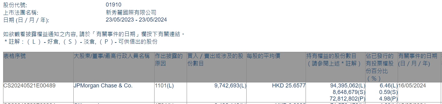 智通财经APP获悉,香港联交所最新资料显示,5月16日,小摩增持新秀丽(01910)974.2693万股,每股作价25.6577港元,总金额约为2.50亿港元。增持后最新持股数目约为9439.51万股,最新持股比例为6.46%。