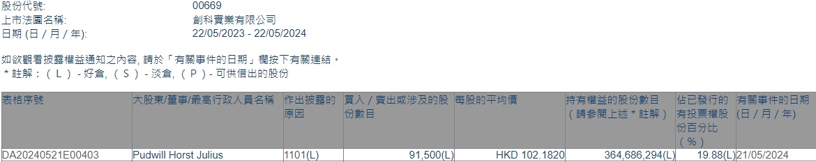 Julius增持创科实业(00669)9.15万股,平均每股作价为102.182港元,总金额约934.97万港元。增持后最新持股数目约为3.65亿股,持股比例为19.88%。