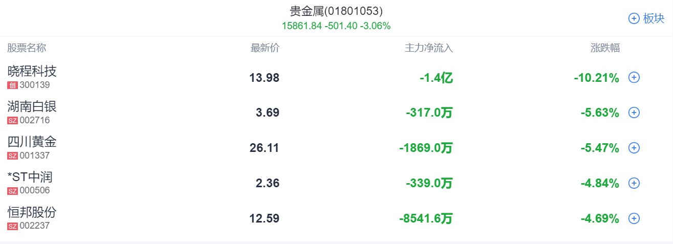 贵金属、小金属、工业金属等金属概念大幅走低,晓程科技跌超9%,北方铜业、盛达资源、湖南白银、西部黄金等跟跌。