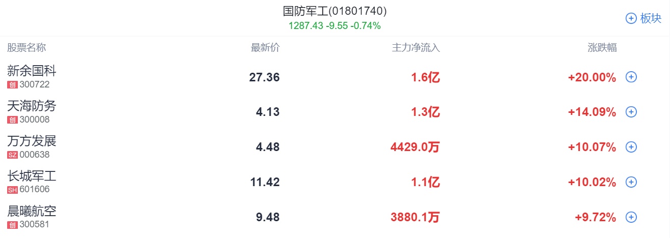 军工板块逆势活跃,长城军工、天海防务、新余国科、万方发展等多股涨停或涨超10%。