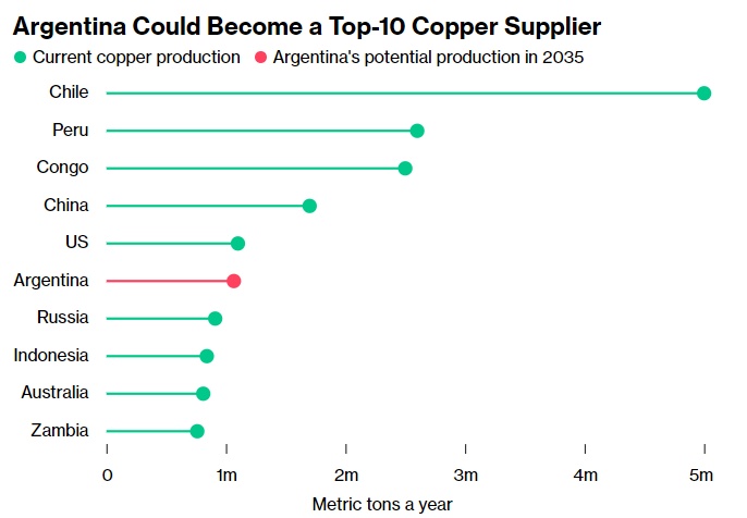 就目前而言,阿根廷几乎不生产铜,尽管它与邻国智利有着相同的地质条件。智利是全球最大的铜出口国。但如果阿根廷正在考虑的20多个铜项目中有6个得以实施,那么到2035年,该国可能成为一个主要的铜供应国,年产量将超过100万吨。据当地矿业集团Caem称,年出口额可能超过80亿美元。