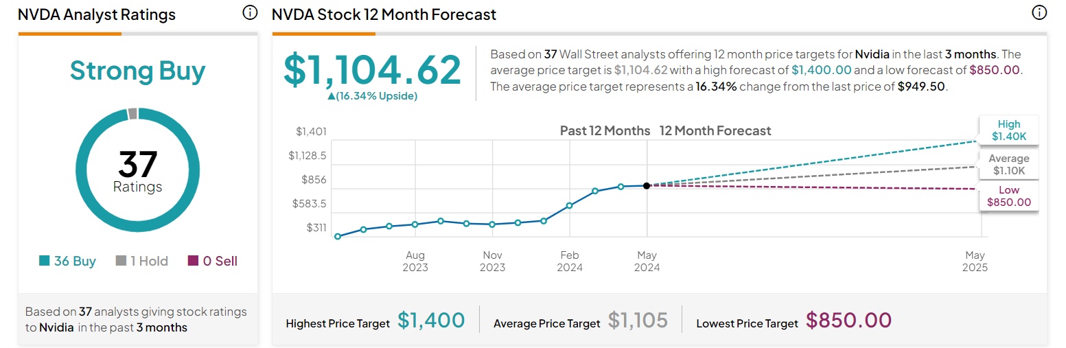 Tipranks汇编的华尔街目标价显示,华尔街投资机构普遍看好AI芯片霸主英伟达后市股价走势。反映一致预期的平均目标价甚至高达1104.62美元,一致评级则为“强力买入”,意味着未来12个月至少高达16%的潜在上行空间,最高目标价甚至高达1400美元。知名投资机构Rosenblatt坚定看涨英伟达,维持1400美元这一强劲看涨价位。富国银行近期大幅上调英伟达目标价,称其数据中心业务可能继续大幅增长,该行将英伟达目标价从970美元大幅上调至1150美元。
