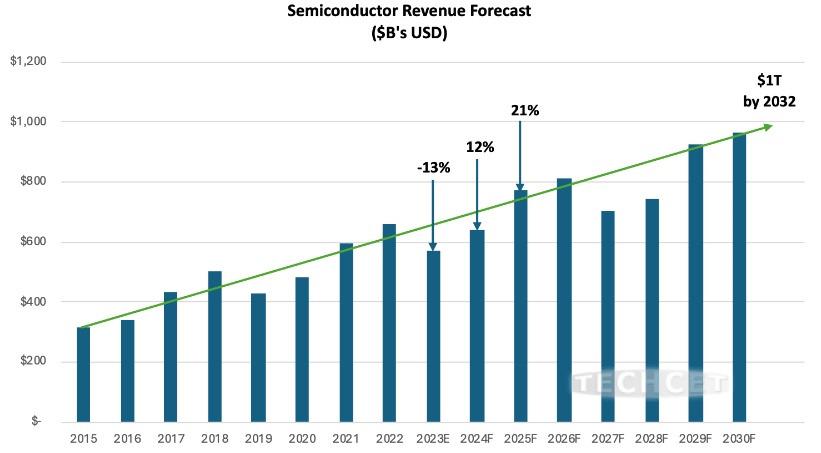 TECHCET近日发布重磅预测报告,预计 2024 年AI芯片持续强劲的需求将引领全球半导体市场进入新一轮上行周期。TECHCET预计 2024 年半导体行业销售额有望大幅增长 12%,随后 2025 年在AI芯片以及更广泛芯片需求刺激下将出现更猛烈增幅,达到 21%。TECHCET预计2031或2032年全球半导体市场规模有望破万亿美元大关。