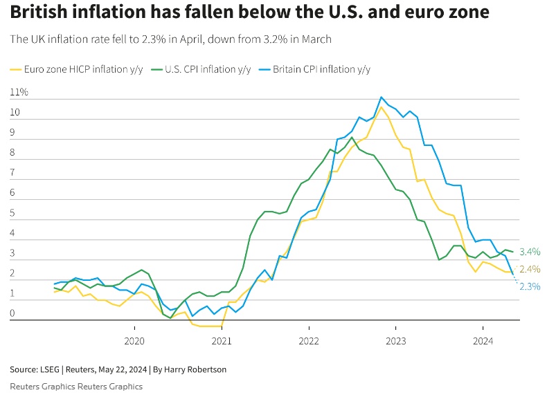 在数据显示英国4月份通胀率降至2.3%后,英国首相苏纳克周三宣布将于7月4日举行大选。苏纳克希望通过传递经济已经转头的信息来扭转保守党低迷的民调数据。
