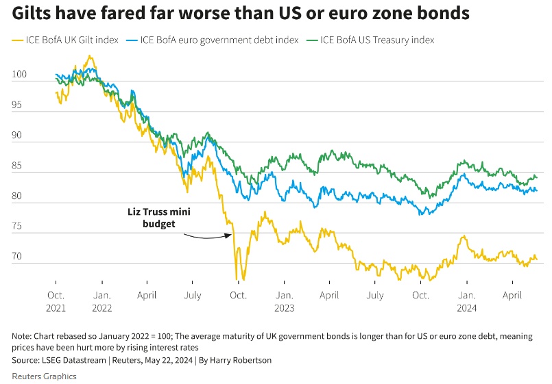 在过去两年里,英国债务受到利率上升和特拉斯迷你预算的沉重打击。美银的英国国债指数自2022年以来下跌了约30%,而欧元区国债和美国国债的跌幅不到20%。