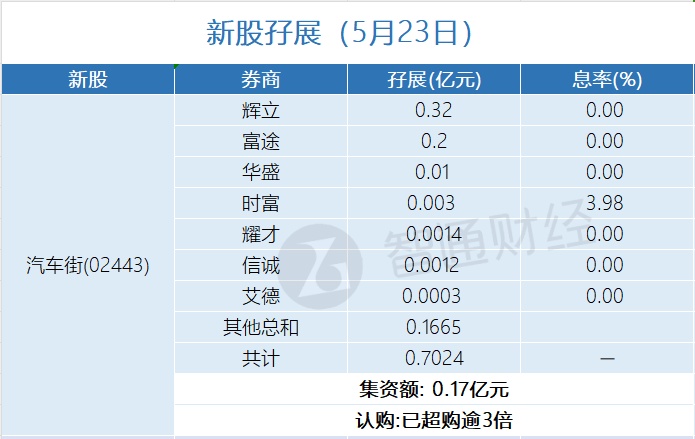 智通财经APP获悉,汽车街(02443)正在招股中。截至5月23日,富途、辉立等券商合计为汽车街借出0.7024亿港元,认购超购倍数逾3倍。
