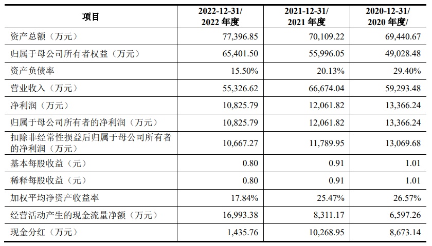 财务方面,2020年度、2021年度、2022年度,金成股份分别实现营业收入约5.93亿元、6.67亿元、5.53亿元人民币;同期,净利润分别约为1.34亿元、1.21亿元、1.08亿元人民币。