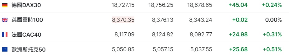 2. 截至发稿,德国DAX指数涨0.24%,英国富时100指数涨0.00%,法国CAC40指数涨0.31%,欧洲斯托克50指数涨0.51%。