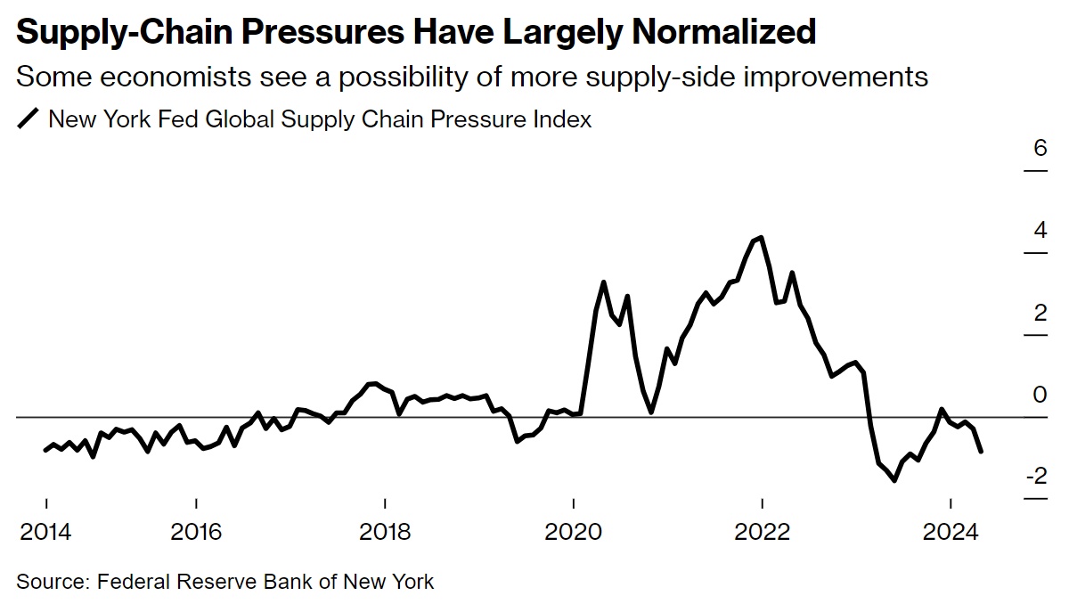 现在,这些因素似乎已基本正常化:纽约联储的全球供应链压力指数(该指数汇集了 27 个变量,衡量从跨境运输成本到国家级制造业数据等各种因素)在过去一年中有所缓解继 2021 年底飙升至创纪录水平后。