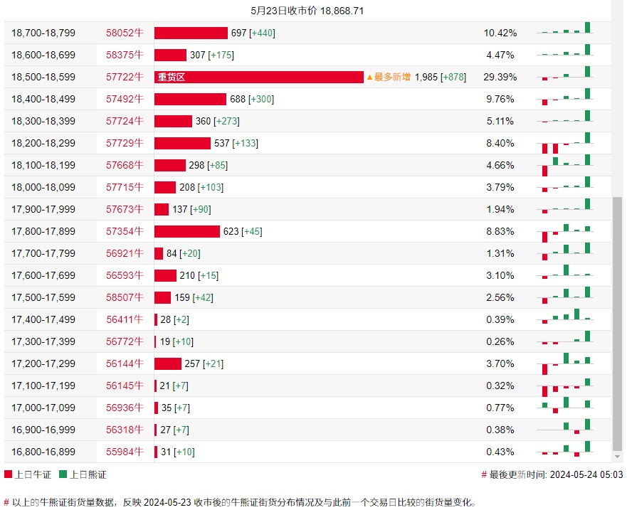 牛证街货重货区和最多新增皆在18500-18599区间,该区间最新熊证数量为1985张,较上一交易日增加878张。