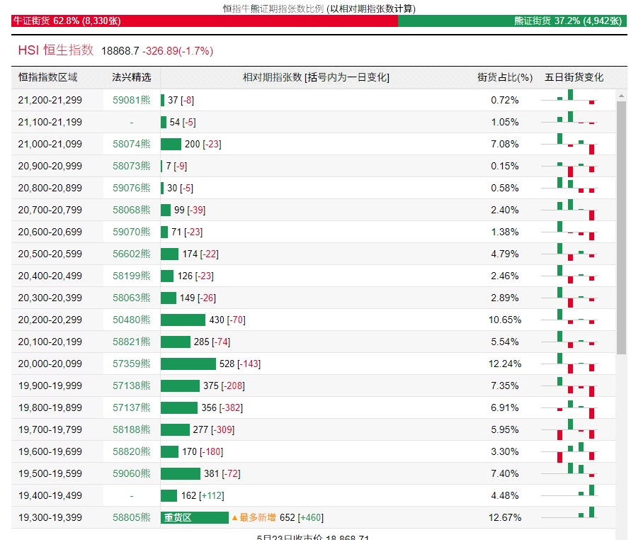 法兴恒指牛熊证街货分布图中的数据显示,熊证街货重货区和最多新增皆在19300-19399区间,该区间最新熊证数量为652张,较上一交易日增加460张。