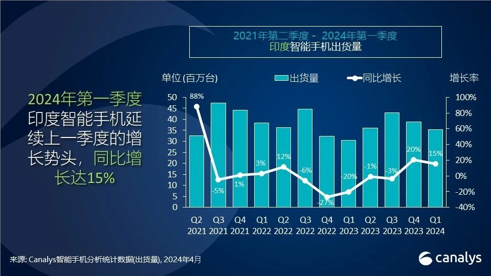 智通财经APP获悉,5月24日,Canalys发文称,2024年第一季度,印度智能手机市场表现强劲,出货量达3530万部。进入2024年后,厂商的库存情况有所改善,这使得渠道能够承接本季度推出的多款新品。由于