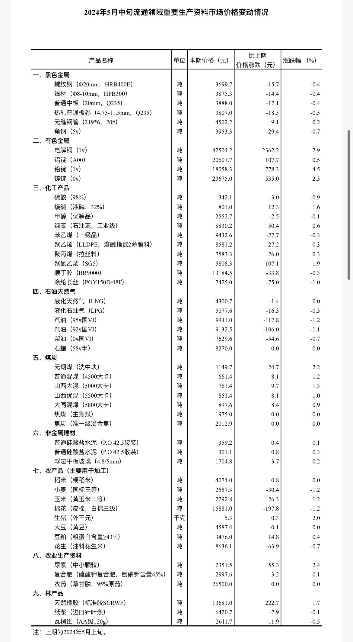 智通财经APP获悉,5月24日,国家统计局公布,对全国流通领域9大类50种重要生产资料市场价格的监测显示,2024年5月中旬与5月上旬相比,24种产品价格上涨,19种下降,7种持平。其中,生猪(外三元)价格为15.3元/千克,环比上涨0.3元/千克,涨幅2%。