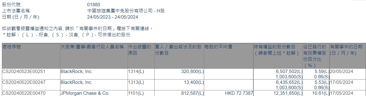 智通财经APP获悉,香港联交所最新资料显示,5月17日,摩根大通增持中国中免(01880)81.2587万股,平均每股作价为72.7387港元,总金额约为5910.65万港元。增持后最新持股数目为1235.1850万股,最新持股比例为10.61%。