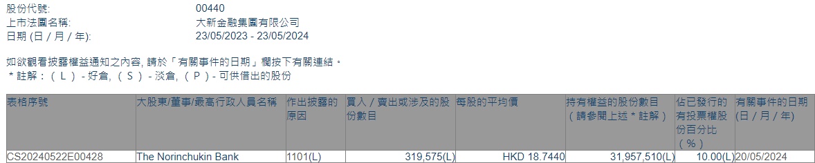 Bank增持大新金融(00440)31.9575万股,平均每股作价为18.744港元,总金额约为599.01万港元。增持后最新持股数目为3195.751万股,最新持股比例为10%。