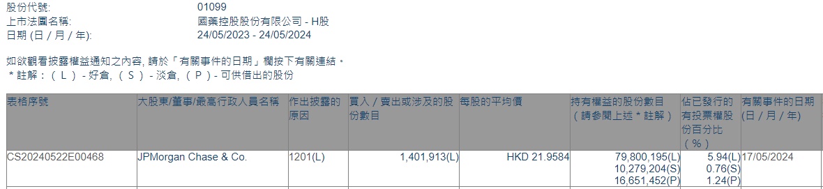 智通财经APP获悉,香港联交所最新资料显示,5月17日,小摩减持国药控股(01099)140.1913万股,每股作价21.9584港元,总金额约为3078.38万港元。减持后最新持股数目约为7980.02万股,最新持股比例为5.94%。