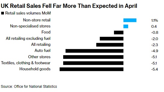 英国国家统计局指出,由于恶劣天气的影响,商店的客流量减少,导致服装、运动器材、游戏和家具的销售表现不佳。4月季调后零售销售同比下降了2.7%,而此前一个月还有0.4%的增长。