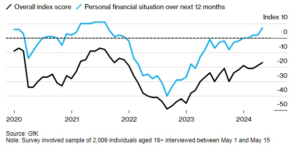 尽管如此,由于经济前景的乐观预期和通胀率降至近三年来的最低水平,家庭预算有所增加,消费者信心也因此连续第二个月得到改善。英国5月Gfk消费者信心指数升至负17,这一数字不仅高于经济学家预期的负18,也远高于一年前生活成本危机严重时期。