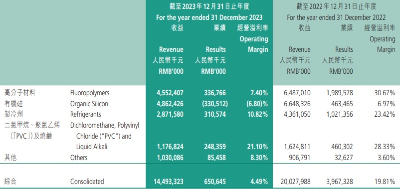 回溯往绩,2019-2022年,东岳集团的收入和归母净利润复合增速分别为16%、38%。2023年,氟硅化工行业景气度较低,部分产品供给产能增加的背景下,下游需求增长未达到预期,导致行业多个主要产品价格明显下滑。身处其中,东岳集团几个主要业务分部的营收、利润表现均有不同程度的下滑。
