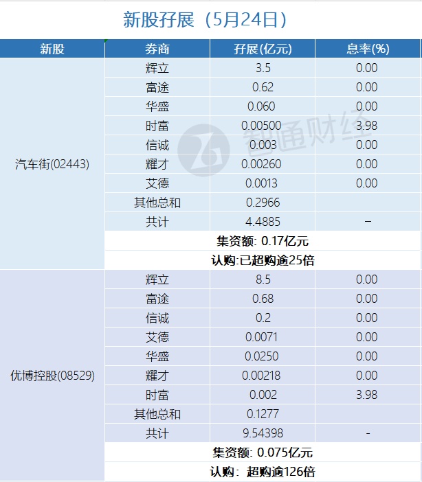 智通财经APP获悉,汽车街(02443)、优博控股(08529)正在招股中。截至5月24日,辉立、富途等券商合计分别为借出孖展汽车街4.4885亿港元,认购倍数逾25倍;为优博控股借出孖展9.54398亿港元,认购倍数逾126倍。