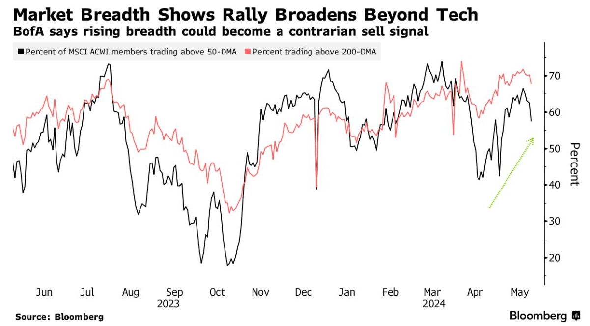Hartnett指出,该指数高于88%将触发反向卖出信号。这位策略师今年对股市的态度更为中性。他在2023年普遍看空,尽管当时标准普尔500指数上涨了24%。