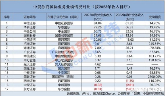 据中新经纬不完全统计,2023年海外业务营收金额排名第一的是中信证券国际,实现营收94.04亿元,同比增长14.78%;华泰国际凭借79.26亿元营收排名第二,较上年增长19.49%。