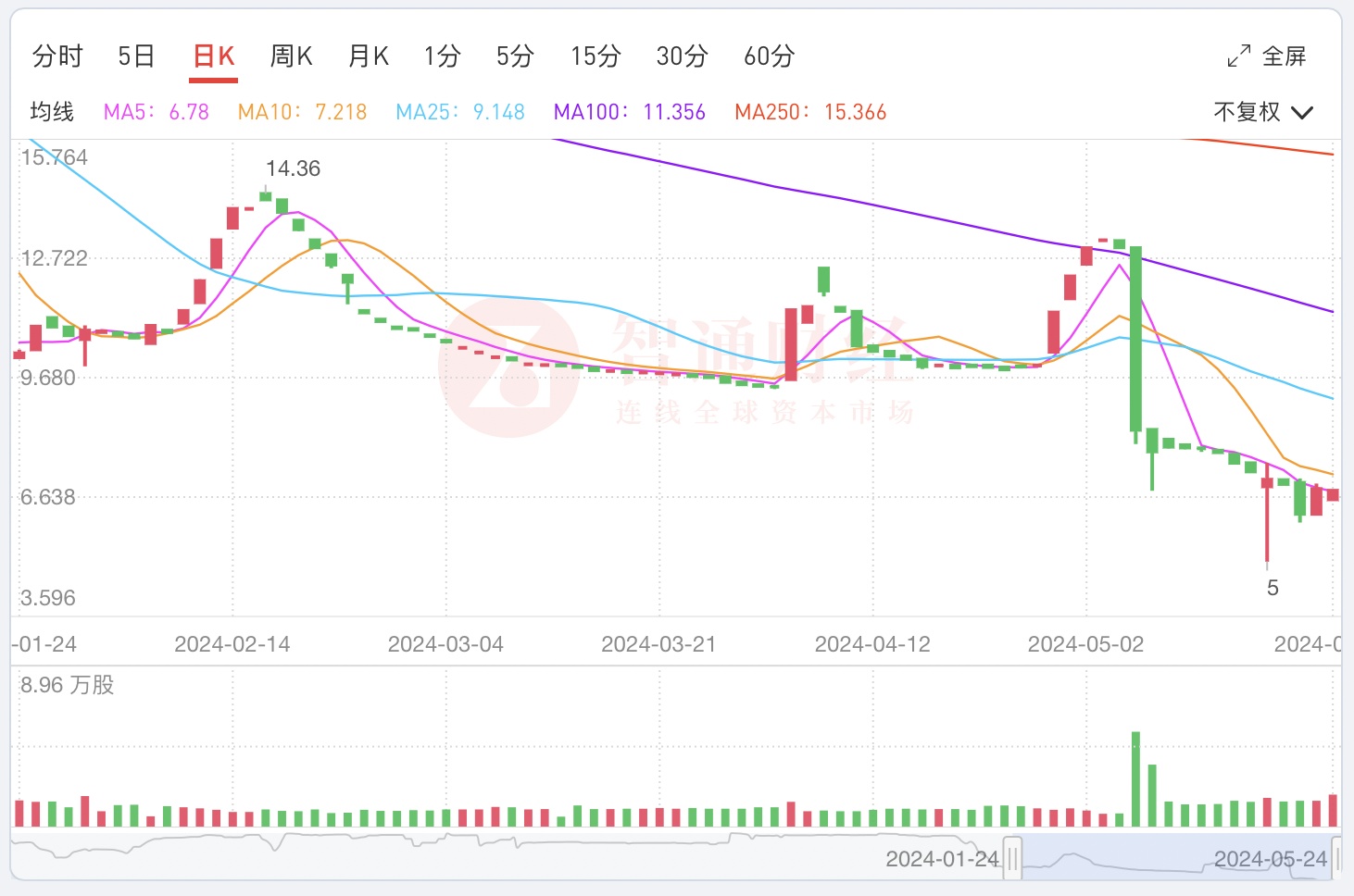 据智通财经APP数据显示, 5月20日于盘中暴跌创下5港元的历史新低水平,随后股价跌幅收窄。5月22日公司股价再度下行,收报6.21港元,全日大跌10.9%。若拉长时间来看,自2024年初股价跳水之后,康沣生物的股价走势就仿佛坐上了过山车,起起伏伏。截至目前,2024首五个月,公司股价已累跌近70%。