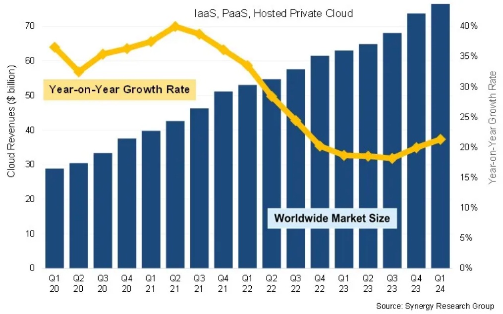 近日,国外研究机构Synergy Research Group公布的最新研究报告显示,2024年第一季度,全球企业云基础设施服务支出达765亿美元,同比增加了135亿美元,增幅21%。这也是该市场连续第二季度实现同比增长。