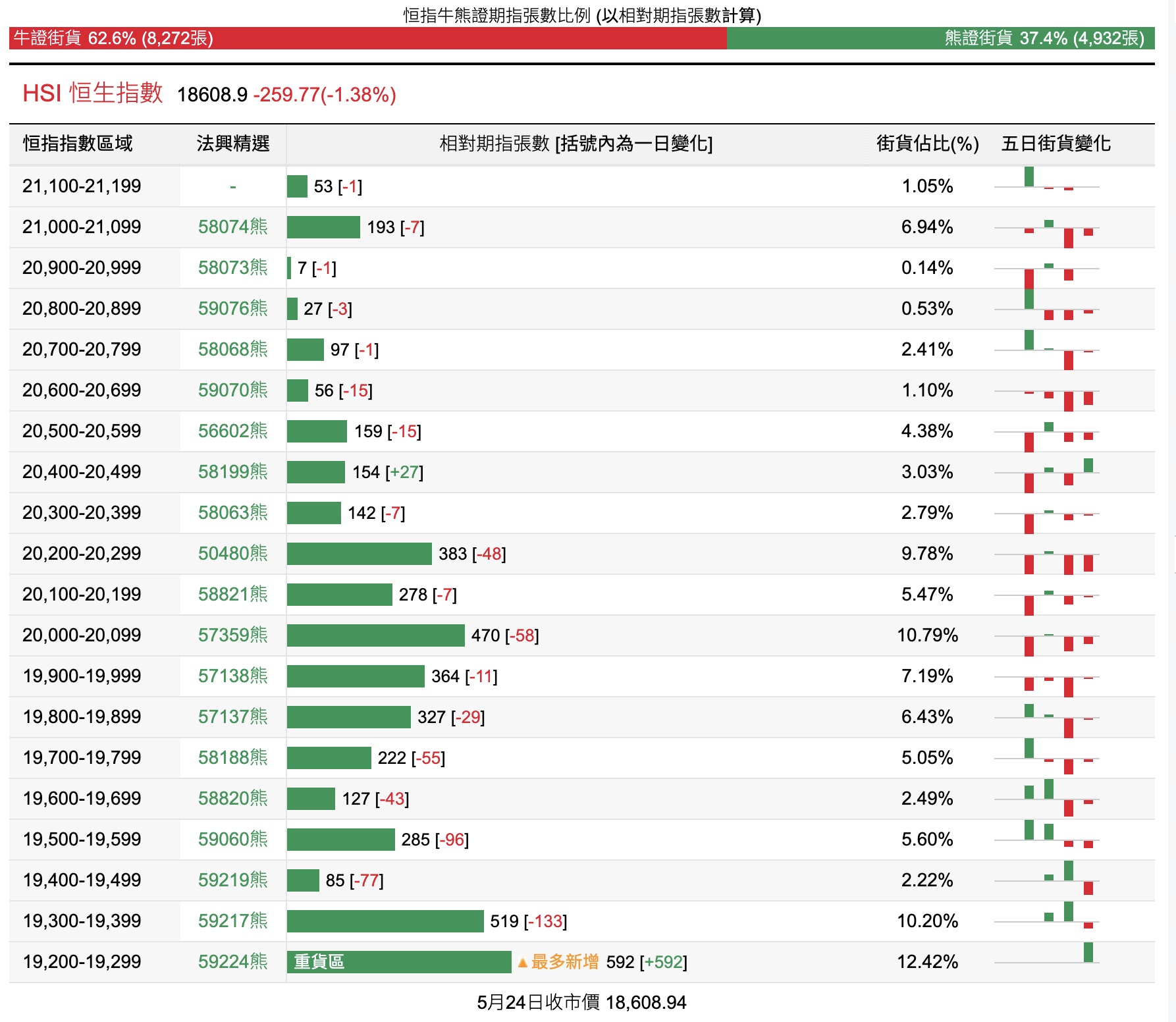 智通财经APP获悉,截至5月25日,恒指最新的牛熊街货比例为63:37。