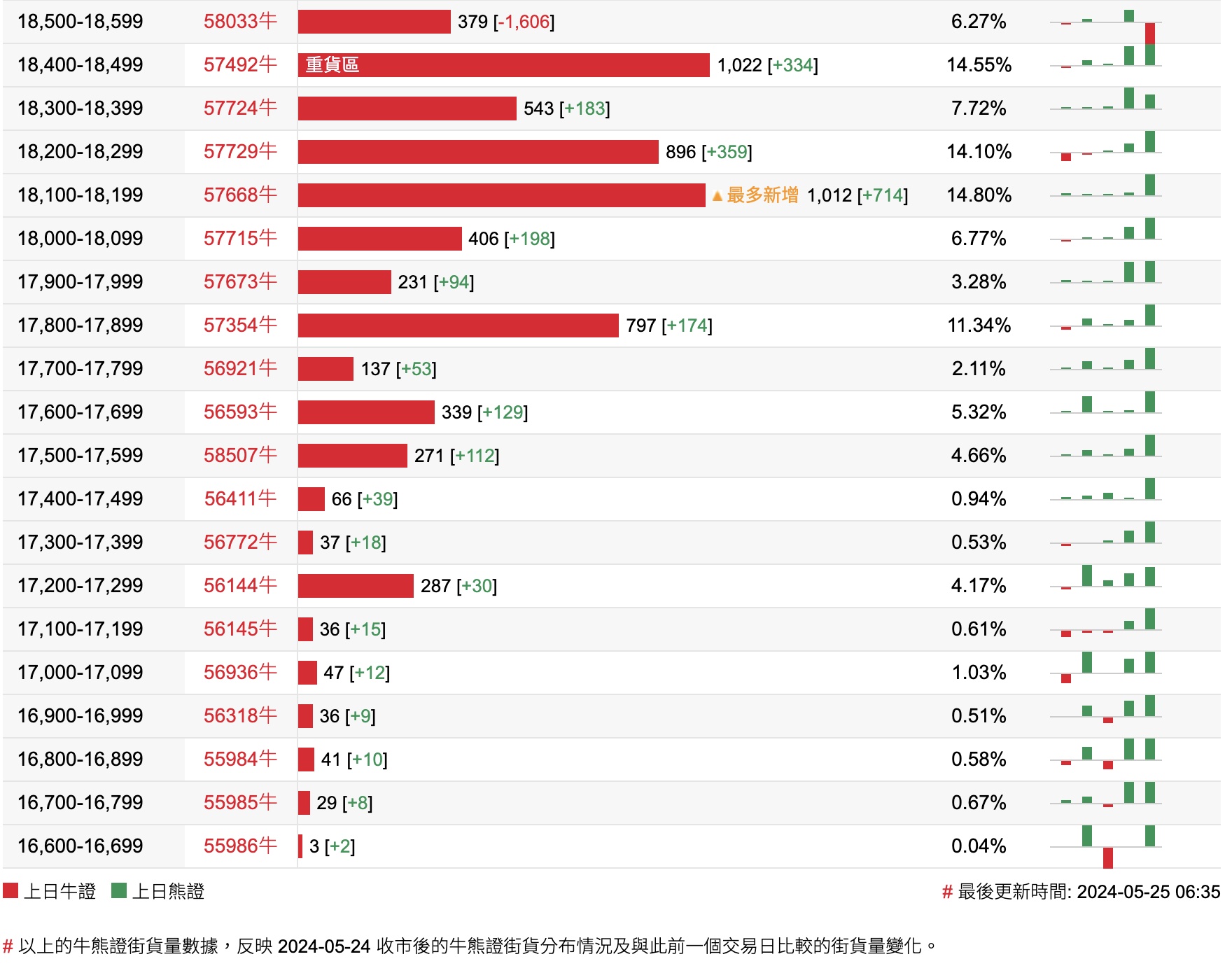 牛证街货重货区在18400-18499区间,该区间最新熊证数量为1022张,较上一交易日增加334张;最多新增在18100-18199区间,该区间最新牛证数量为1012张,较上一交易日增加714张。