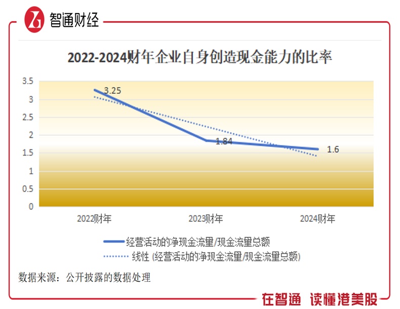 根据智通财经APP计算,2022至2024财年,滔搏自身创造现金能力的比率(经营活动的净现金流量/现金流量总额)持续下滑,分别为3.25、1.84及1.6。该比率数值下降,表明滔搏自身创造现金能力正逐步弱化,财力基础出现松动,偿债能力和对外筹资能力均受到影响。