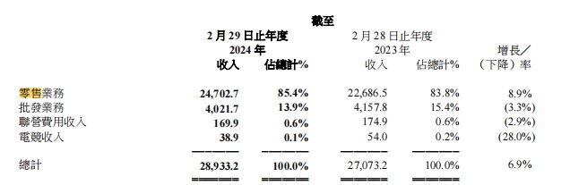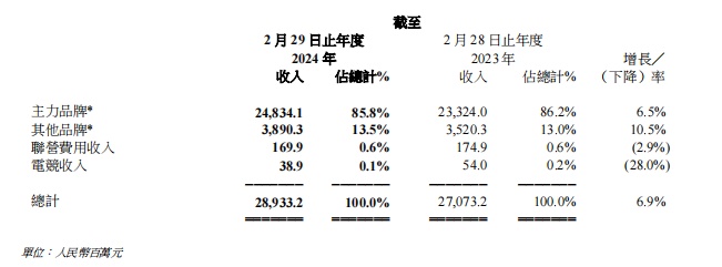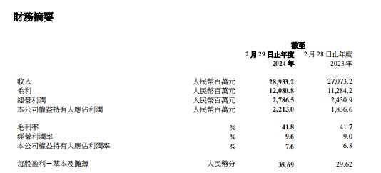 5月22日,公司发布了公司2023/2024财年全年业绩公告。业绩报告显示,截至2月29日止2023/24财年,公司实现收入289.33亿元(单位:人民币,下同),同比增长6.87%;公司权益持有人应占利润22.13亿元,同比增长20.5%。营收及净利增速分别低于花旗此前预期的8%及21%。