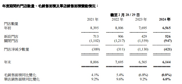 值得关注的是,零售驱动以门店为基本盘。截至2024年2月29日,滔搏共运营6144家直营店铺,店铺总数同比减少6.4%,毛销售面积同比减少0.8%,单店销售面积同比增加6.0%。拉长时间线来看,公司门店数量锐减,较2021年关店近2000家。值得欣慰的是,滔搏门店减少速度较上一个财年大幅缓解。