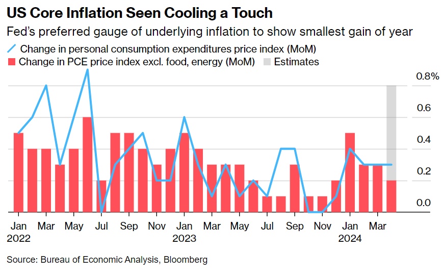 本周,美联储最青睐的通胀数据——核心PCE通胀数据将正式公布,而在经济学们看来,该数据大概率将暗示美联储在抗击通胀方面的积极进展。经济学家们普遍预计,4月份扣除食品和能源的核心PCE指数将环比上升0.2%,这将是该指数今年迄今为止的最小增幅,4月整体PCE物价指数可能连续三个月攀升0.3%。