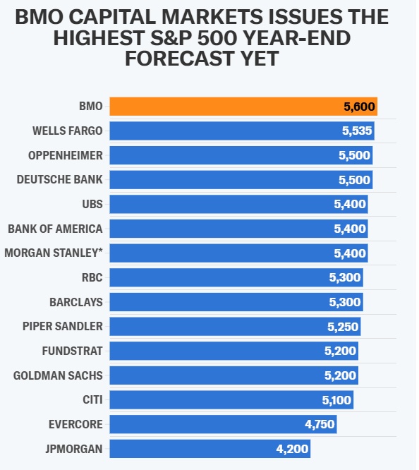 华尔街知名空头、摩根士丹利首席股票策略师迈克尔•威尔逊(Michael Wilson)目前预计美股基准指数——标普500指数到2025年6月之前有望升至5500点(上周该指数收于5304点位)。随着市场持续上涨,这位策略师对2023年的悲观预期未能实现,他最终让步,将标普500指数的目标点从4500点上调至5400点。这使他的预测从华尔街最低的预测之一,一跃成为预计该指数创下新纪录的华尔街最乐观预期之一。