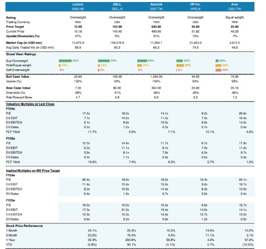 在发布本报告的同时,大摩将联想和华硕的评级提升至增持,并将联想列为在大中华区科技硬件领域的首选,而在美国,大摩重申对戴尔和惠普的增持评级,戴尔仍是在美国 IT 硬件领域的首选。