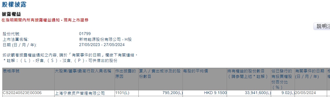 智通财经APP获悉,香港联交所最新资料显示,5月20日,宁泉资产增持新特能源(01799)79.52万股,平均每股作价为9.15港元,总金额约为727.608万港元。增持后最新持股数目为3394.16万股,最新持股比例为9.02%。