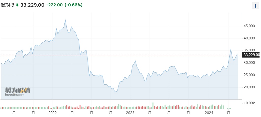 尽管铜价上周创下新高成为各大媒体关注的焦点,但锡仍是今年迄今表现最强劲的贱金属。伦敦金属交易所(LME)三个月期锡期货合约目前的交易价格约为每吨33,500美元,较1月初上涨32%,而铜价涨幅为21%。